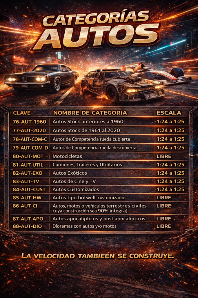 | 88-AUT-DIO | Dioramas con autos y/o motocicletas asi como vehiculos terrestres civiles. | Libre |
