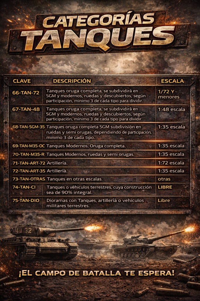 | 66-TAN-72 | Tanques oruga completa, se subdividirá en SGM y modernos, ruedas y descubiertos, según participación, mínimo 3 de cada tipo para dividir. | 1/72 Y menores |