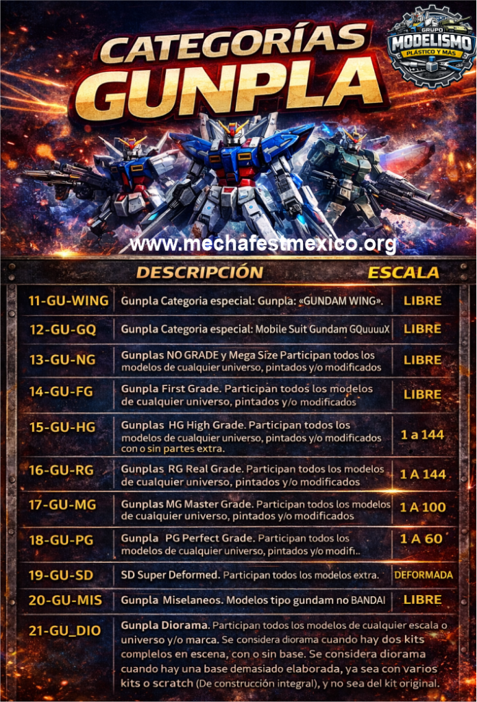 | 17-GU-MG | Gunplas MG Master Grade. Participan todos los modelos de cualquier universo, pintados y/o modificados con o sin partes extra. | 1 a 100 |